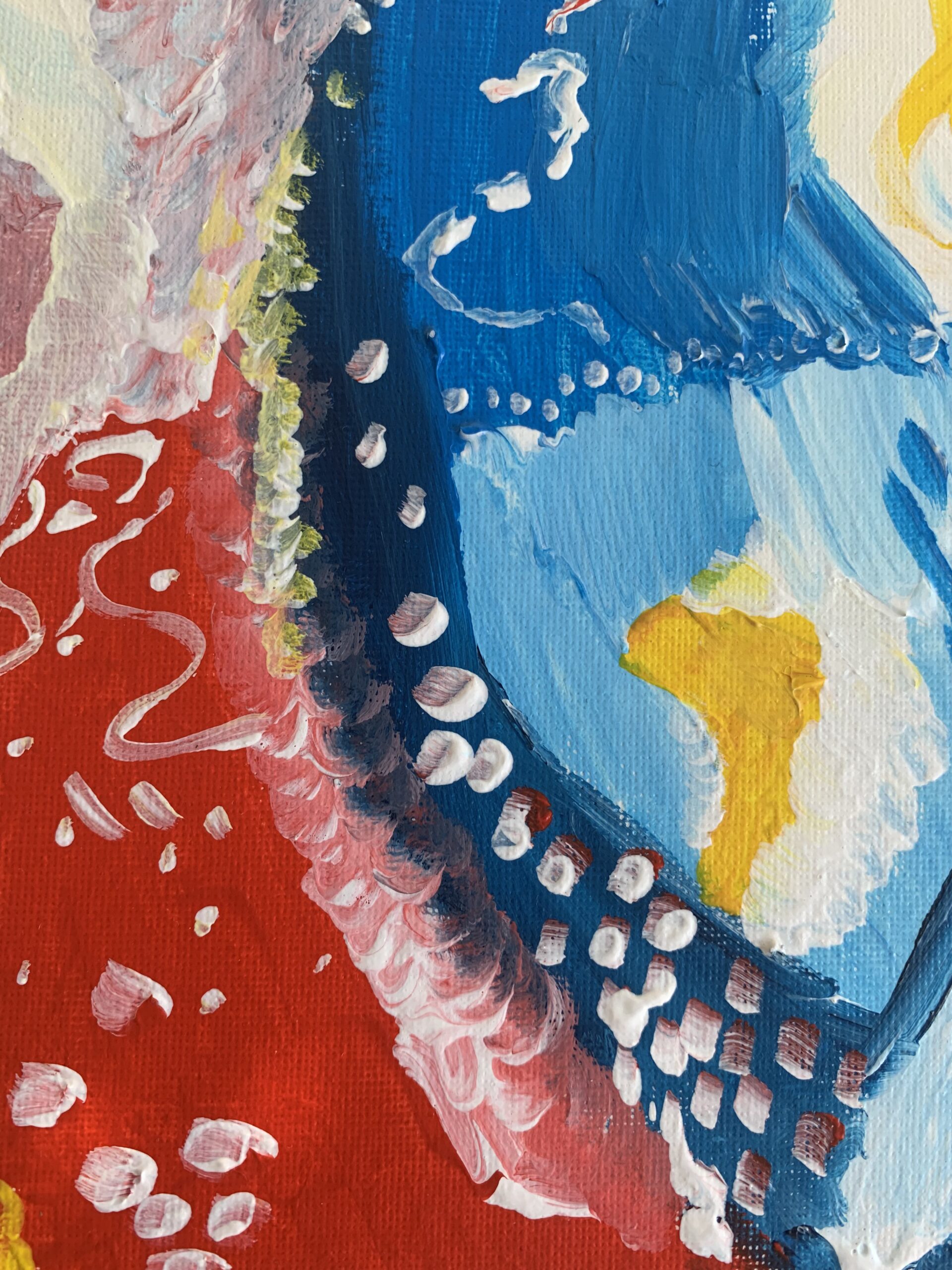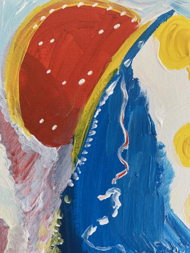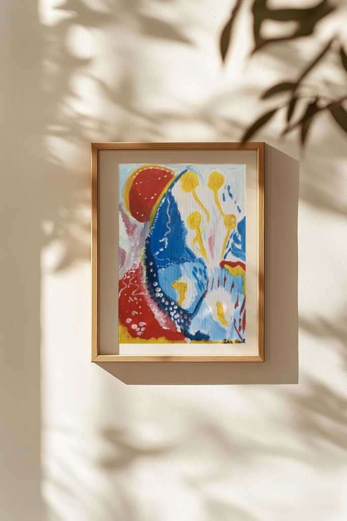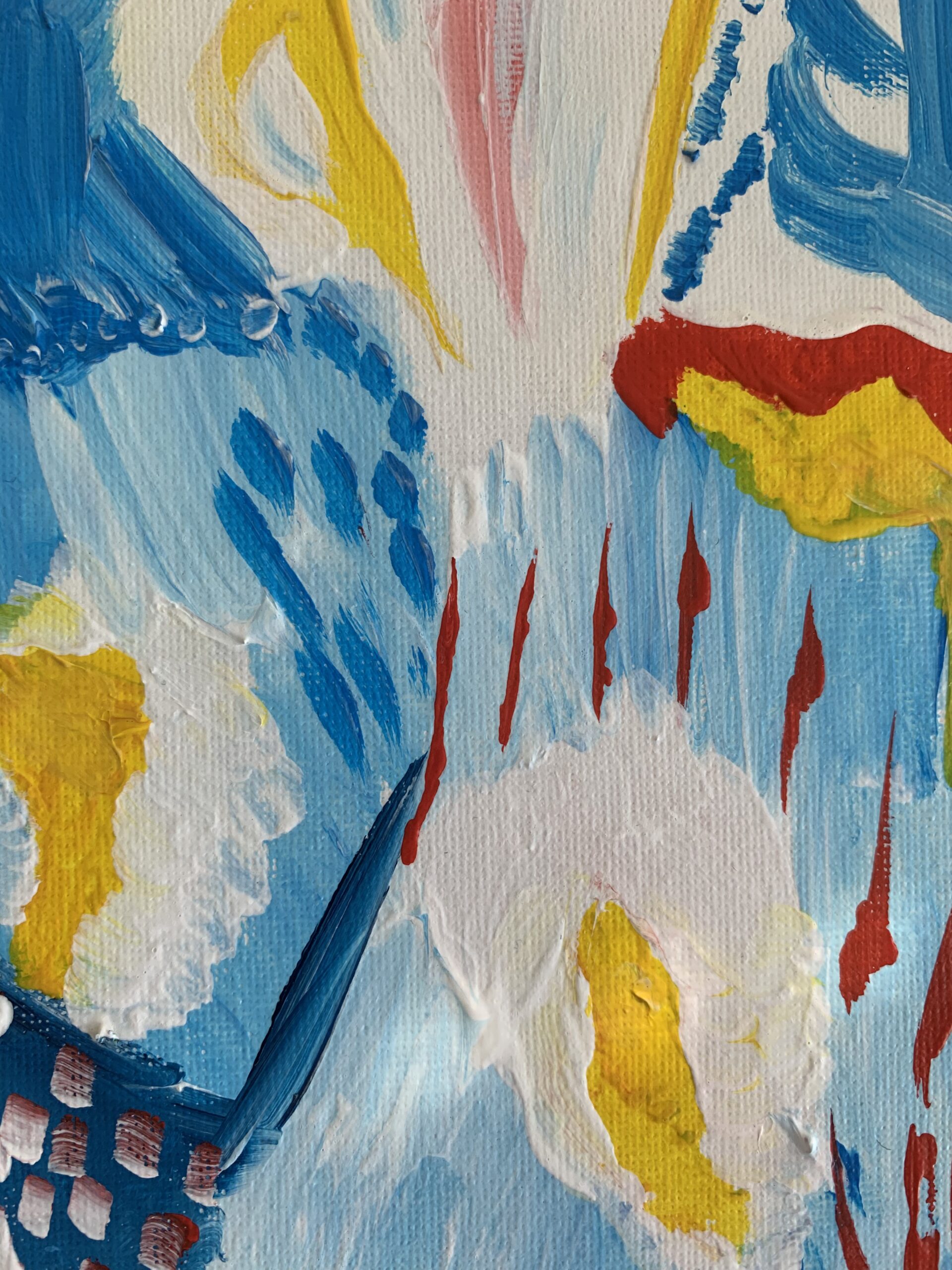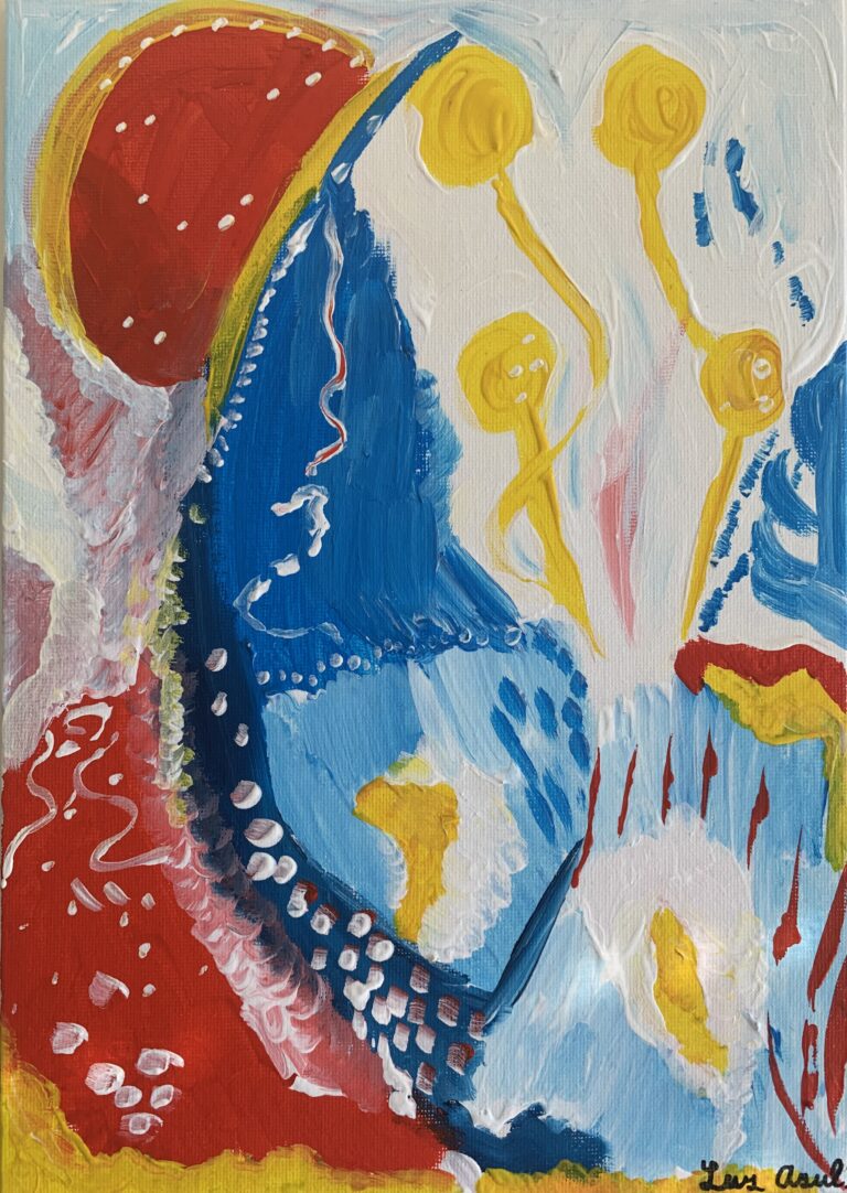 Lily is a small canvas painting that whispers the delicate transition between winter and warm summer. Glowing flowers bloom softly across the surface, while in the right corner, two blossoms face forward, their golden buds catching the light. Every detail, from subtle textures to bold strokes of red, blue, and yellow, conveys a vibrant, abstract energy. Lily radiates light, warmth, and magic, inviting the viewer to feel its luminous spirit.