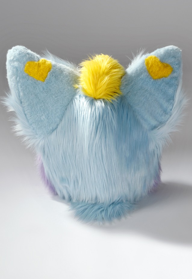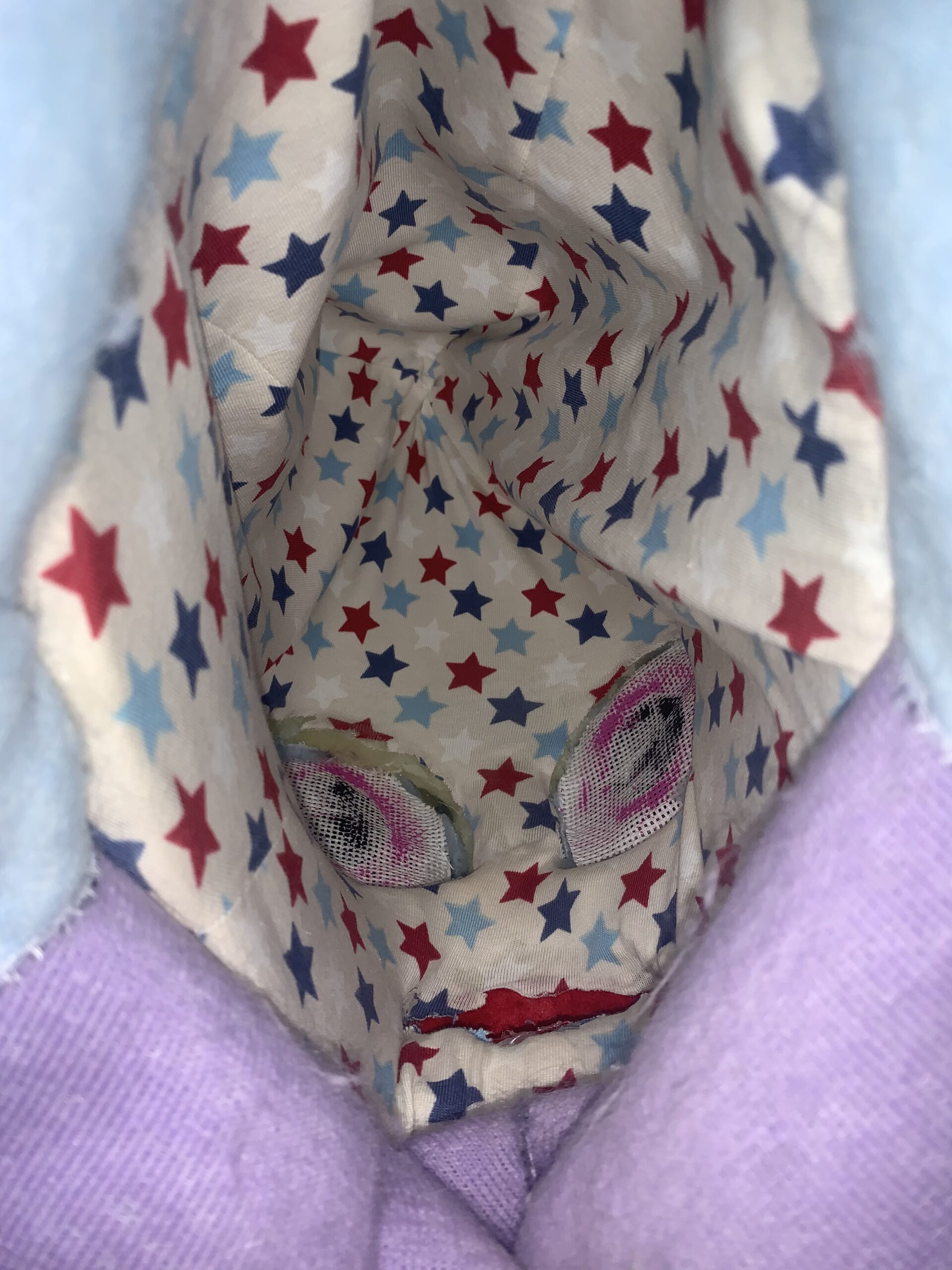 Ears: baby blue with hand-crafted yellow hearts on the back and soft yellow on the inside — a detail full of optimism and charm