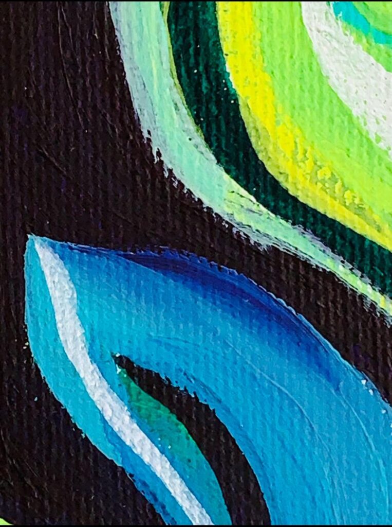 Vajola is a unique, original abstract painting inspired by music. The music came to me as a vision, which I then transformed into colors and shapes. The main element is a green clover placed slightly to the left on the paper canvas, composed of several streams of colors flowing like water, creating a dynamic, moving effect. Inside the swirling clover is a rose with a blue sparkle, symbolizing magic and lightness. From the lower part of the clover, a stream of blue energy radiates, capturing tones and melodies perceptible on an emotional level – this painting is music expressed in abstraction.