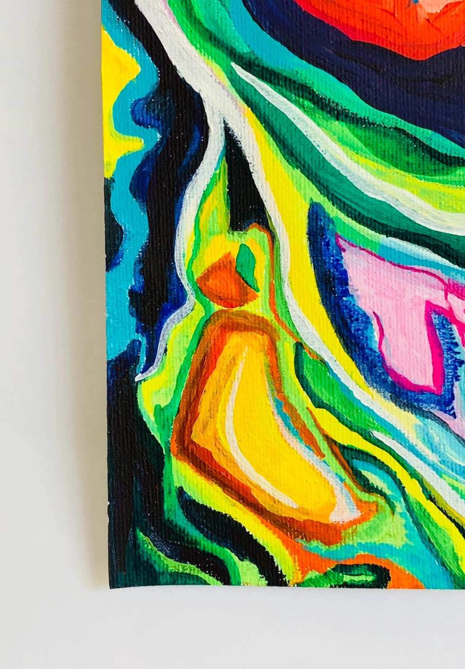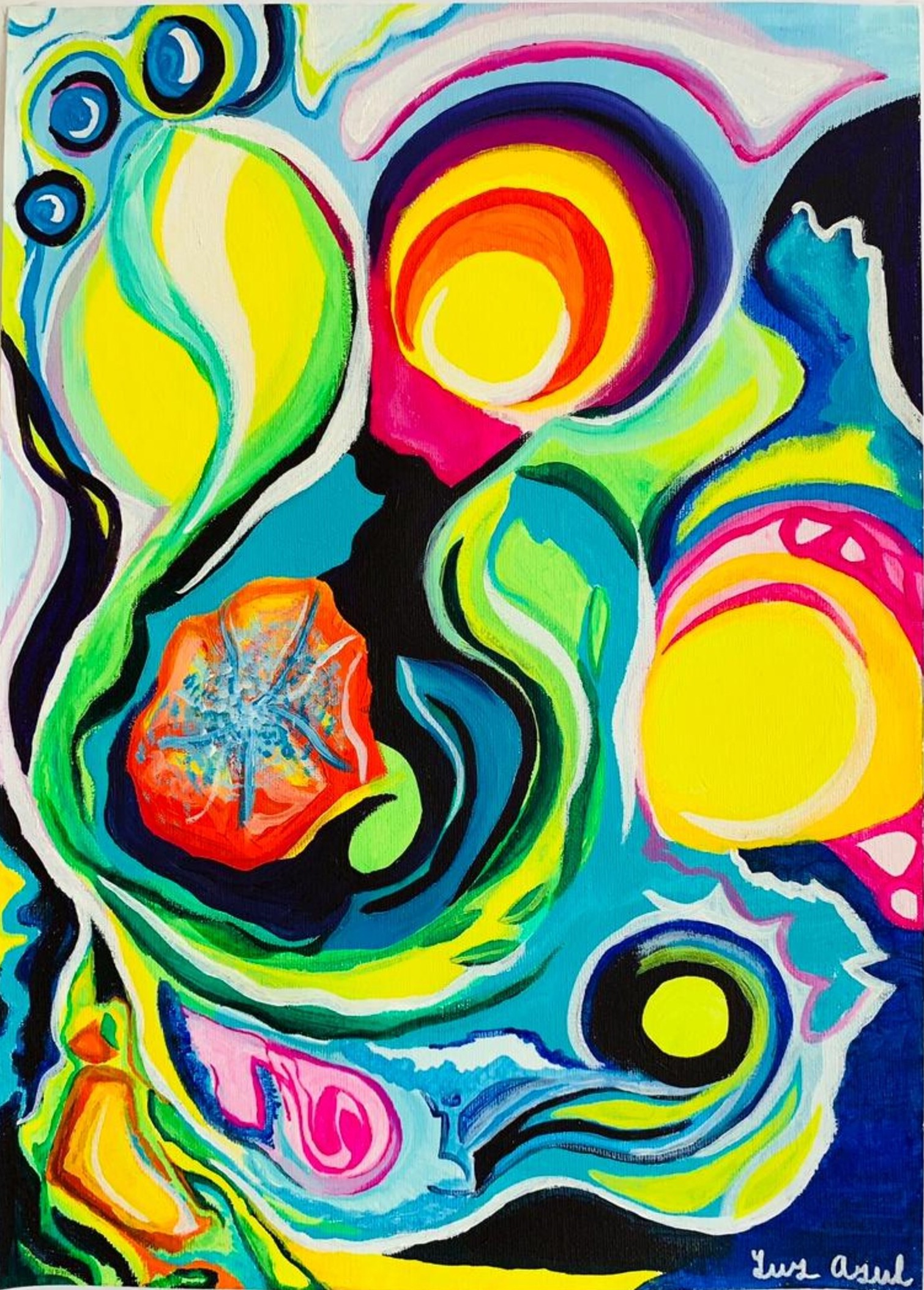 Vajola is a unique, original abstract painting inspired by music. The music came to me as a vision, which I then transformed into colors and shapes. The main element is a green clover placed slightly to the left on the paper canvas, composed of several streams of colors flowing like water, creating a dynamic, moving effect. Inside the swirling clover is a rose with a blue sparkle, symbolizing magic and lightness. From the lower part of the clover, a stream of blue energy radiates, capturing tones and melodies perceptible on an emotional level – this painting is music expressed in abstraction.